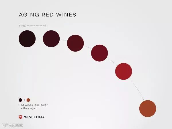 红葡萄酒的色泽会慢慢由深变浅,颜色从原来的紫色、紫红色向橙色发展,最后甚至能变成砖红色或棕色。与此同时,酒里的单宁逐渐变少,酸度也逐渐降低,原来新鲜的果味会被水果干、蘑菇、树叶、皮革等味道逐渐取代。