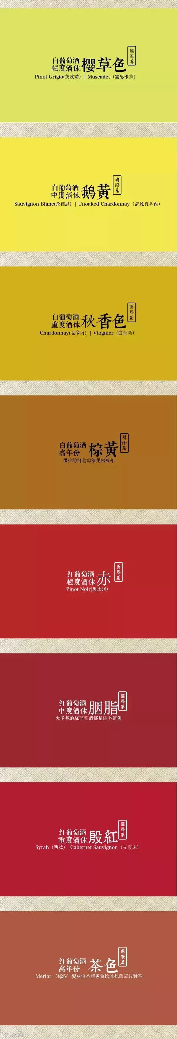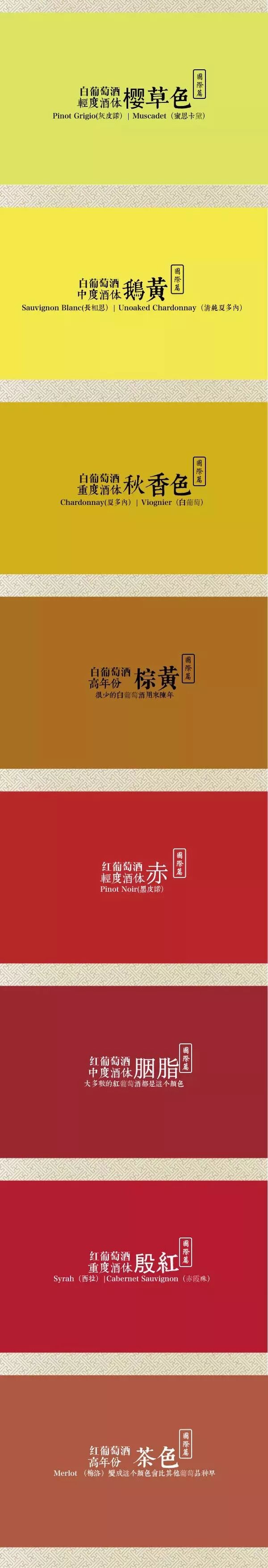 在对一款葡萄酒品质和真伪的判断中,颜色是非常重要的部分。不过更为重要的,是还要把颜色透露出来的信息,结合品尝时感受到的风味表现,综合在一起来判断,才能得出更全面更准确的判断。下面以图片的形式给大家直观的展示葡萄酒各个级别的酒体所对应的颜色及所酿造的葡萄品种,赶快来看看吧!