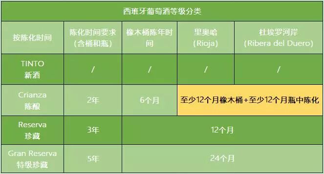 按陈化时间分级制度,分别包含以下级别(从高到低):Gran Reserva、Reserva、Crianza、Joven。