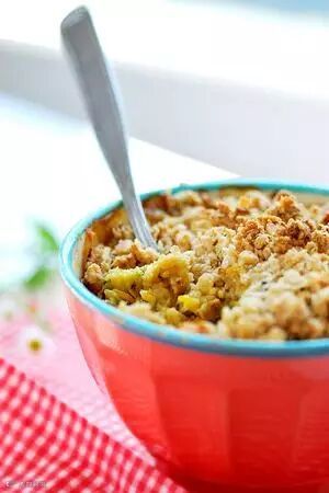 Crumble是在二次世界大战时起源于英国的甜品。虽说起源于英国,但它的发明人还是法国移民来的厨师。Crumble吃起来很像饼干屑,里面一般是水果,比如苹果、rhubarb、桃子等等。