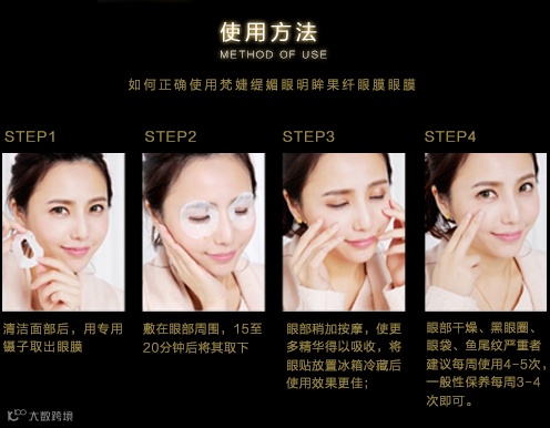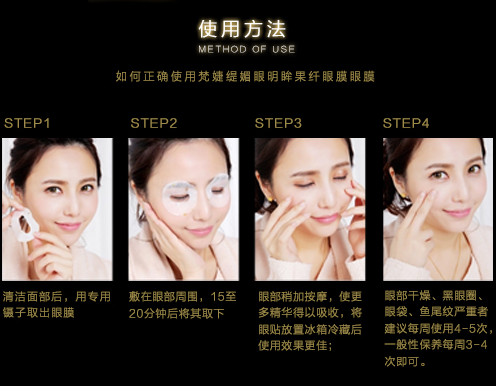 用专用镊子取出一对眼膜,敷在眼部周围,15-20分钟后将其取下,用眼部按摩的方式稍加按摩,使更多精华得以吸收。清洗干净之后可使用眼胶/眼霜等眼部保养品。眼部干燥、黑眼圈、眼袋、鱼尾纹严重者建议每周使用3-4次,一般保养每周2-3次即可。