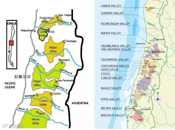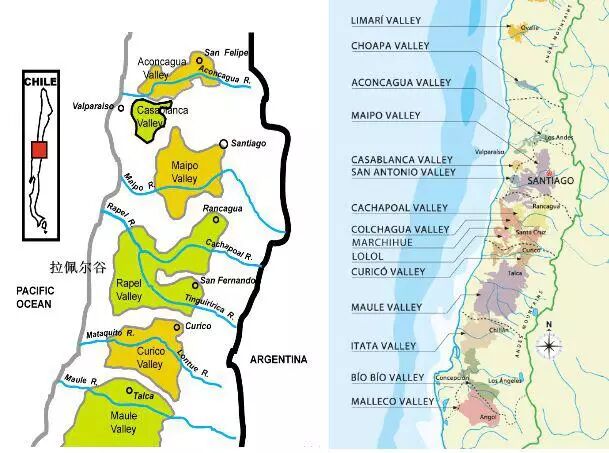 拉佩尔谷由空加瓜谷(COLCHAGUA VALLEY)和卡恰布谷(CACHAPOAL VALLEY)两个产区组成,前者以出产优秀的赤霞珠、美乐和佳美娜(CARMENERE)为名。后者的赤霞珠和佳美娜同样口碑在外,大量的外资融入使得这里成为智利最备受瞩目的产区之一。