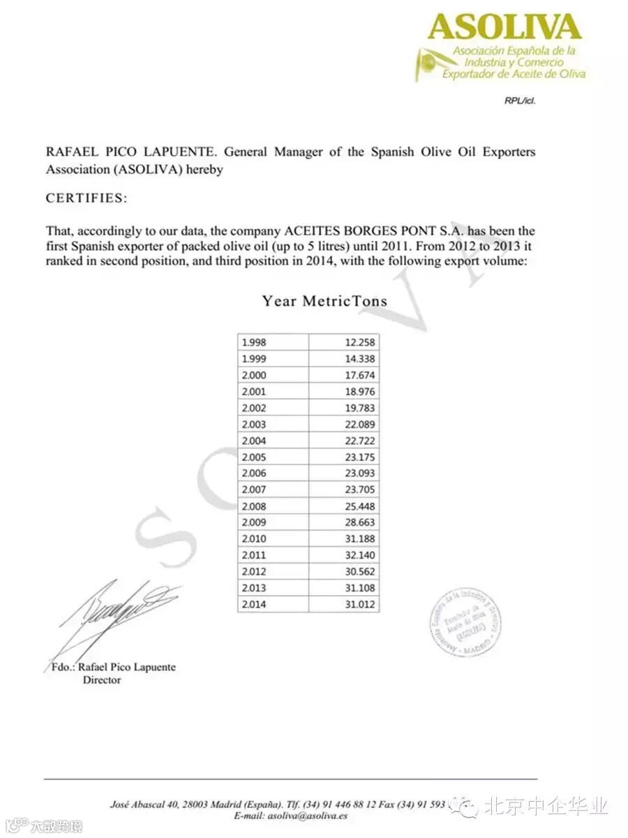 上图便是伯爵集团在西班牙橄榄油出口商协会(ASOLIVA)拿到的证明:从1998年-2011年,橄榄油出口量第一;2012年-2013年,橄榄油出口量第二;2014年的橄榄油出口量排名第三。事实证明,“连续多年西班牙出口量领先”这句话,不是空口无凭、不是空穴来风、不是吹牛,我们一直在凭事实说话。