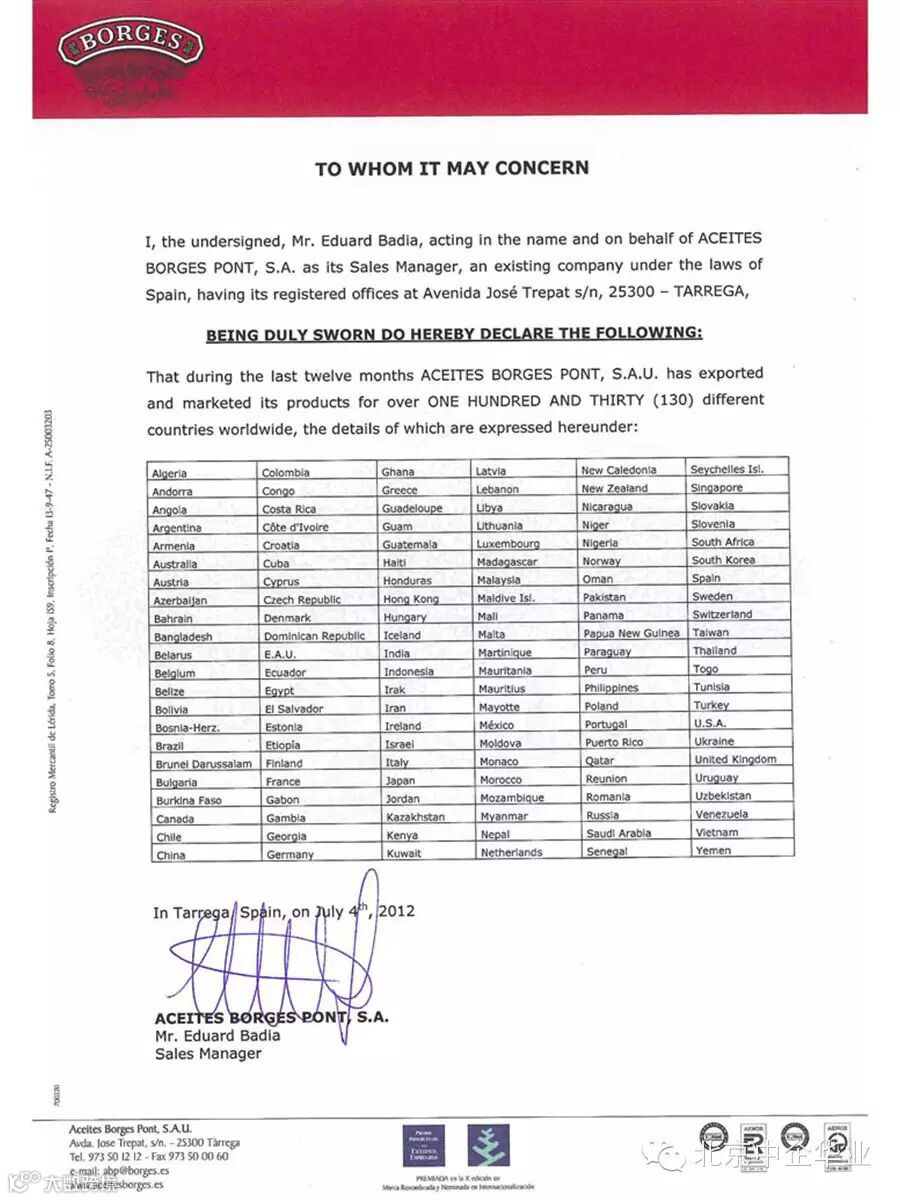 伯爵橄榄油连续多年西班牙出口量领先的证明