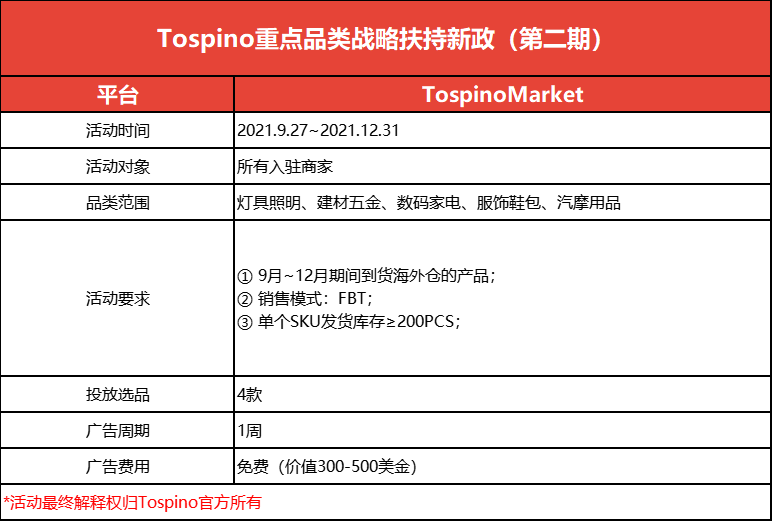同时也要在这里向大家公布:Tospino2021年重点品类战略扶持新政第二期活动已经开始咯!满足相应条件的商家,即可参加本次活动。