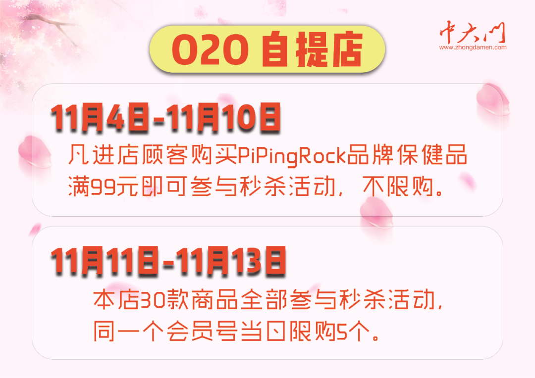 凡进店顾客购买PiPingRock品牌保健品满99元即可参与秒杀活动,不限购。