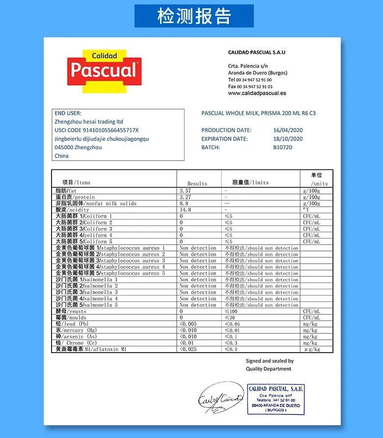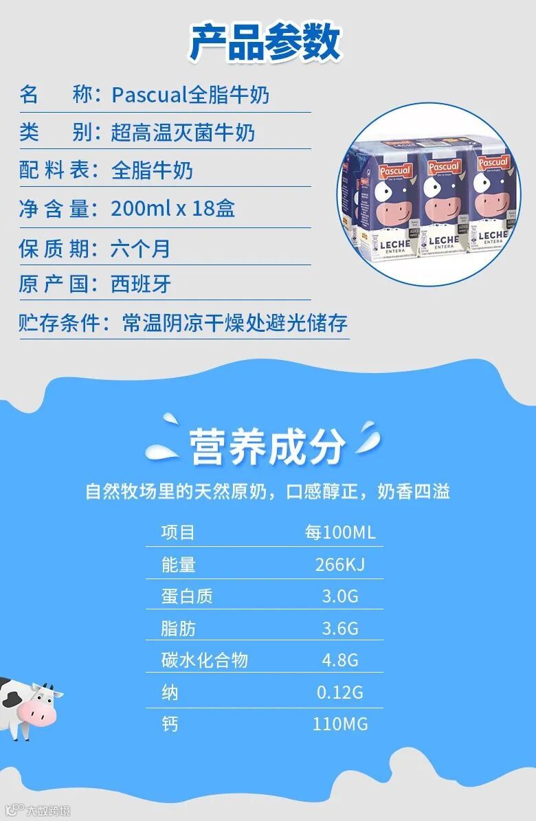 原装进口的Pascual全脂牛奶,菌落总数标准超过欧洲标准,每毫升的菌落总数低于50万,使牛奶更加安全。Pascual全脂牛奶每毫升的体细胞低于40万。国际乳业通识,体细胞数越低,鲜奶质量越高。