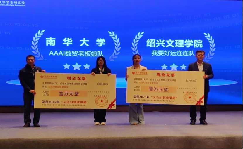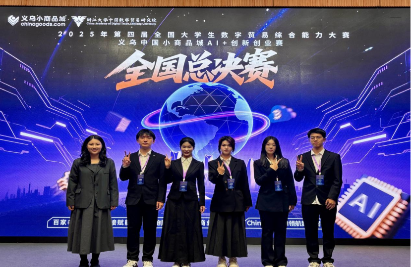 10月22-24日第四届全国大学生数字贸易综合能力大赛——义乌中国小商品城AI+创新创业大赛全国总决赛在义乌中国小商品城隆重举行。本届大赛由浙江大学中国数字贸易研究院深度联合义乌中国小商品城大数据公司,基于义乌小商品市场得天独厚的商贸资源和Chinagoods 平台的成熟数贸基建及创新 AI 产品集群,鼓励大学生与市场百家名企深度链接,通过真实命题促进数字化创新应用。自2025年1月赛事正式启动后,全国309所高校、2279支参赛团队历经初赛、省赛层层选拔,最终105支表现卓越的团队脱颖而出进入为期三个月的全国总决赛,我校由商学院和数理信息学院学生组成的团队(成员:高静怡、闫恒依、俞炬枫、胡芷妍、蓝景毅,指导老师:江爱情、刘俞希)成功入选。