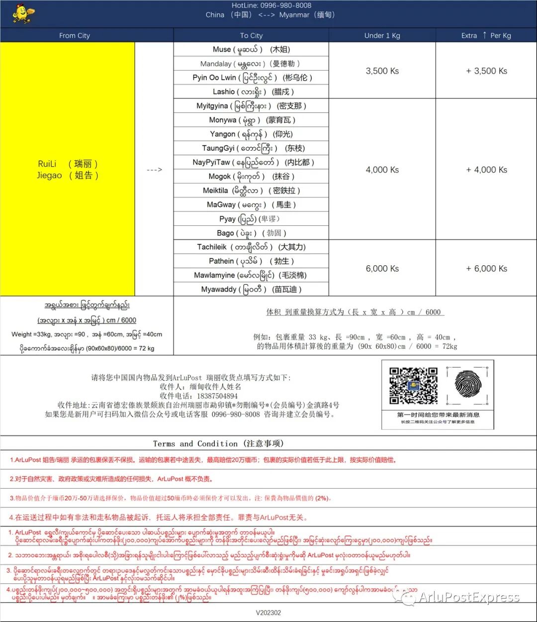首先,感谢您一直以来对 ArLuPost 的信任与支持。在过去的两年中由于疫情以及国门关闭给中缅跨境快递带来了极大的挑战,由于目前陆运口岸已趋于稳定,我们深刻意识到客户对价格的重视,因此我们决定第一时间下调我们的价格,以回馈您们对ArLuPost的信任和支持。