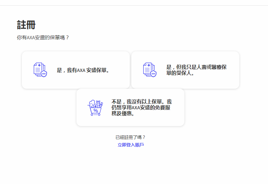 在注册账户页面,点击「是,我有AXA安盛保单-人寿-医疗-储蓄及投资-根据您如实的资料填写资料