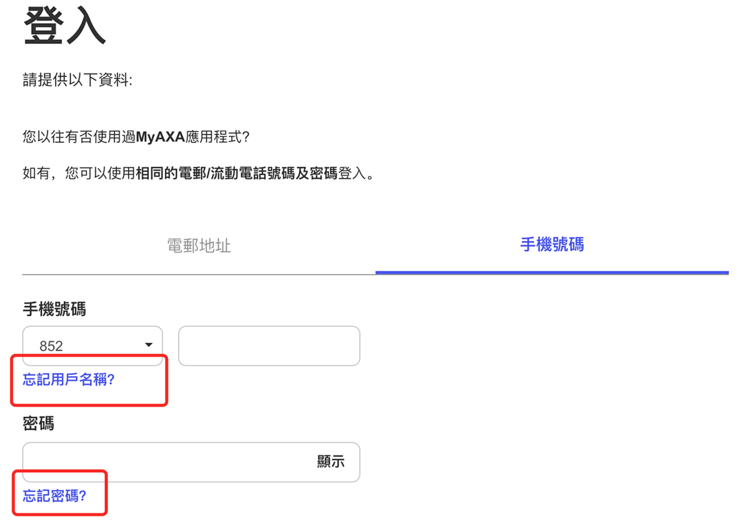 填写MyAXA登入资料(电邮或手机号码及密码)。点击登入