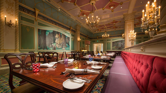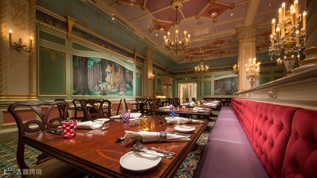 最高端大气上档次的“皇家宴会厅”位于整个迪士尼乐园的核心迪士尼城堡处,这也是园区内唯一一个点菜式的餐厅。Tiffany蓝的菜单非常霸气有木有?这里菜品均为统一的三道式西餐,你可以选择前菜、主菜和甜品各一道,价格是368元。想想看,坐在城堡里享受美味,是不是有成为公主的感觉。