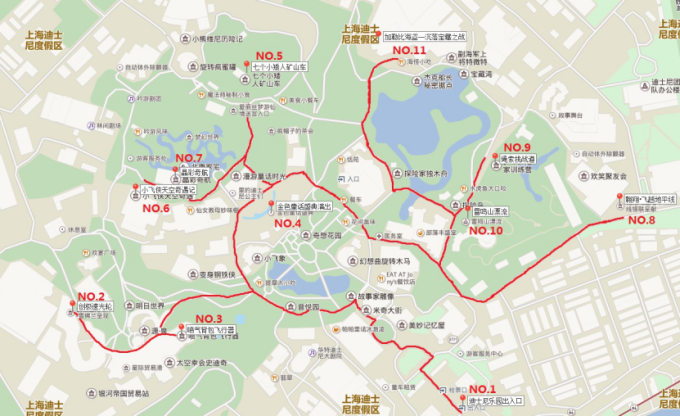 刺激惊险路线:创极速光轮 → 喷气背包飞行器 → 金色童话盛典演出 → 七个小矮人矿山车 → 小飞侠天空奇遇记 → 晶彩奇航 → 翱翔•飞越地平线 → 绳索挑战道 → 雷鸣山漂流 → 加勒比海盗—沉落宝藏之战