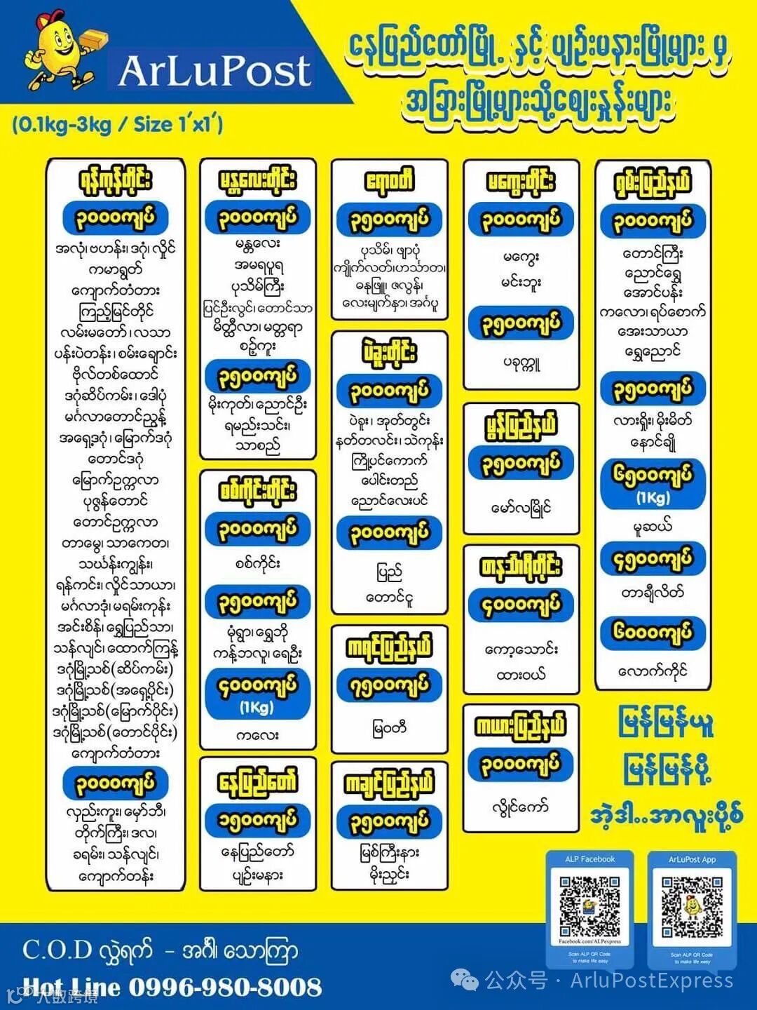 ArLuPost 一直专注于提供安全可靠,高服务品质、高效率的快递服务,让您的包裹在最短的时间内安全送达目的地。无论您是需要中国国内代收、代购或缅甸国内快递,我们都能为您提供最优惠的运费和最优质的服务。现在就选择ArLuPost,让我们为您的包裹送上最快速、最安全、最贴心的服务体验!今天我们又为您新增了彬马那(PyinMaNa)(ပျဉ်းမနား)分点、这也是Arlupost的第101家分店 我们在彬马那期待您的光临。