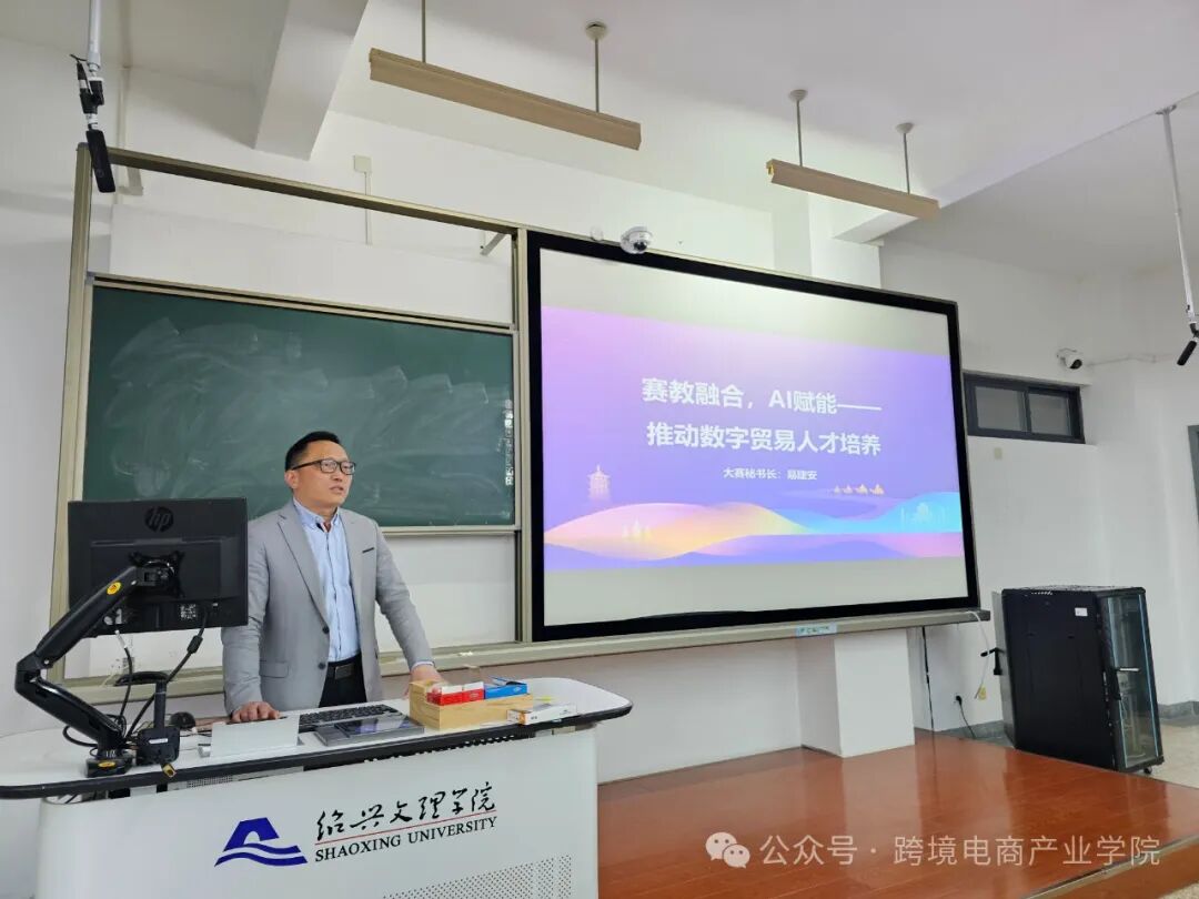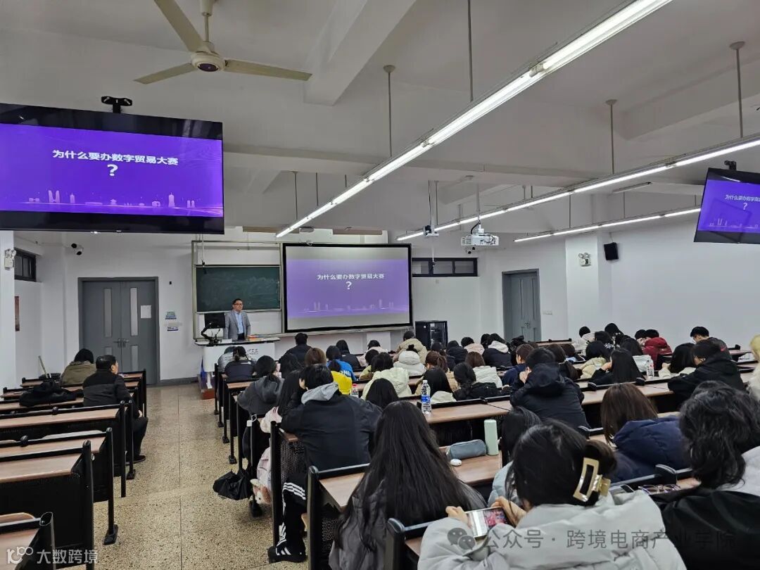 易秘书长介绍了大赛的起源、发展的历程、主办单位和大赛委员会组成成员情况,特别强调了大赛符合国际贸易、国际商务专业方向,采用产教融合校企合作的模式,顺应数字经济时代跨境贸易的新趋势,并用众多案例说明了大学生参加学科竞赛的作用,所能获得的知识与能力,鼓励大家积极参加数字贸易综合能力大赛。学院也给予了支持措施。