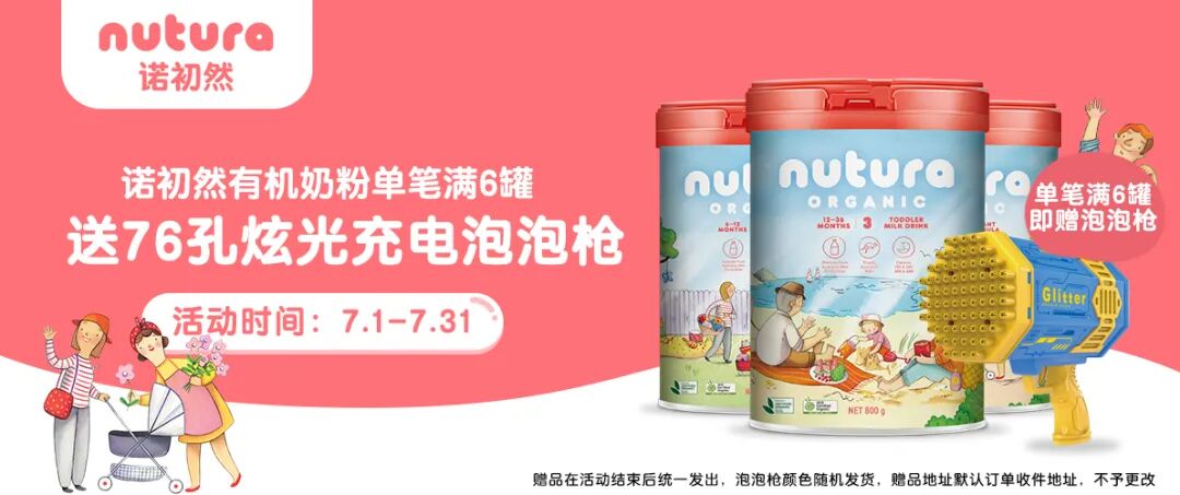 3.在活动时间内,于【爱纷美全球购】购买诺初然任一段位有机奶粉且单笔满6罐者,即可获赠76孔炫光充电款泡泡枪1个。