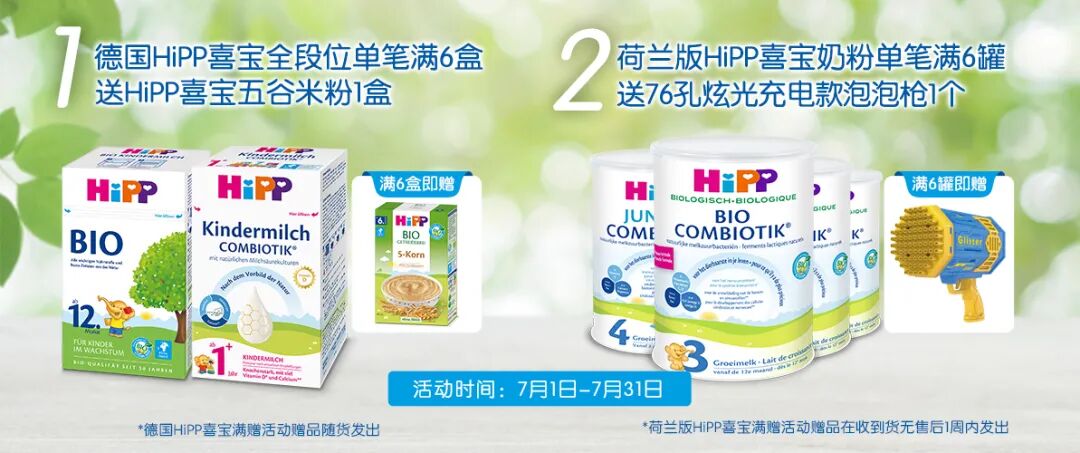 2.在活动时间内,于【爱纷美全球购】购买荷兰版HiPP喜宝任一段位奶粉且单笔满6罐者,即可获赠76孔炫光充电款泡泡枪1个。