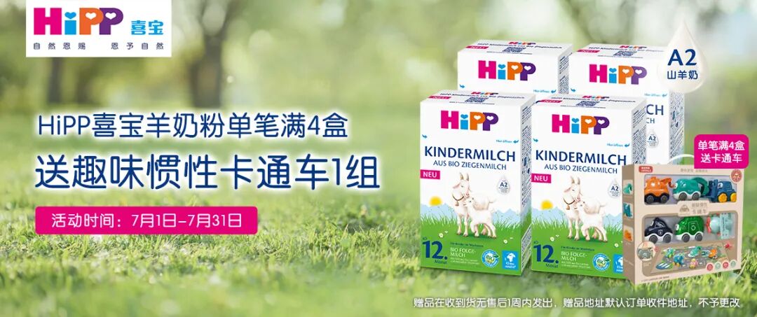 1.在活动时间内,于【爱纷美全球购】购买德国HiPP喜宝任一段位奶粉且单笔满6罐者,即可获赠HiPP喜宝五谷米粉1盒。