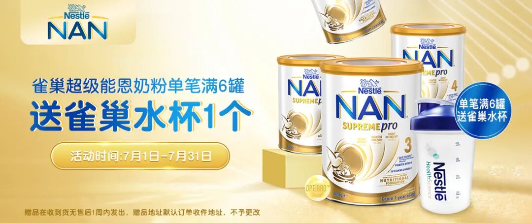 4.在活动时间内,于【爱纷美全球购】购买雀巢超级能恩任一段位奶粉且单笔满6罐者,即可获赠雀巢多功能水杯1个。