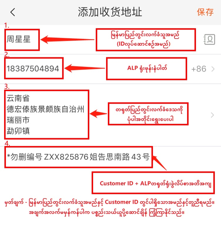 ArLuPost ၏ Facebook page(သို့) Hot Line Customer Services နှင့်ဆက်သွယ်ပြီး,မြန်မာပြည်တွင်းလက်ခံသူ၏အမည်၊ ဖုန်း၊ လိပ်စာကိုပေးပြီး Customer ID ရယူပါ။ Taobao မှဝယ်ယူရာတွင် အောက်ပုံအတိုင်းဖြည့်စွက်ပေးပါ။