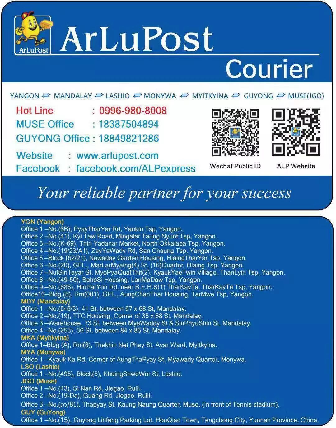 မှတ်ချက်။ ။ArLuPost ရုံးခွဲများ COVID-19 ရောဂါကာကွယ်နှိပ်နင်းရေးကာလအတွင်း အစိုးရထုတ်ပြန်ချက်အလိုက် အပြောင်းအလဲများရှိနိုင်သည်။ မေးမြန်လိုပါက Customer Service နှင့်ဆက်သွယ်မေးမြန်နိုင်ပါသည်။