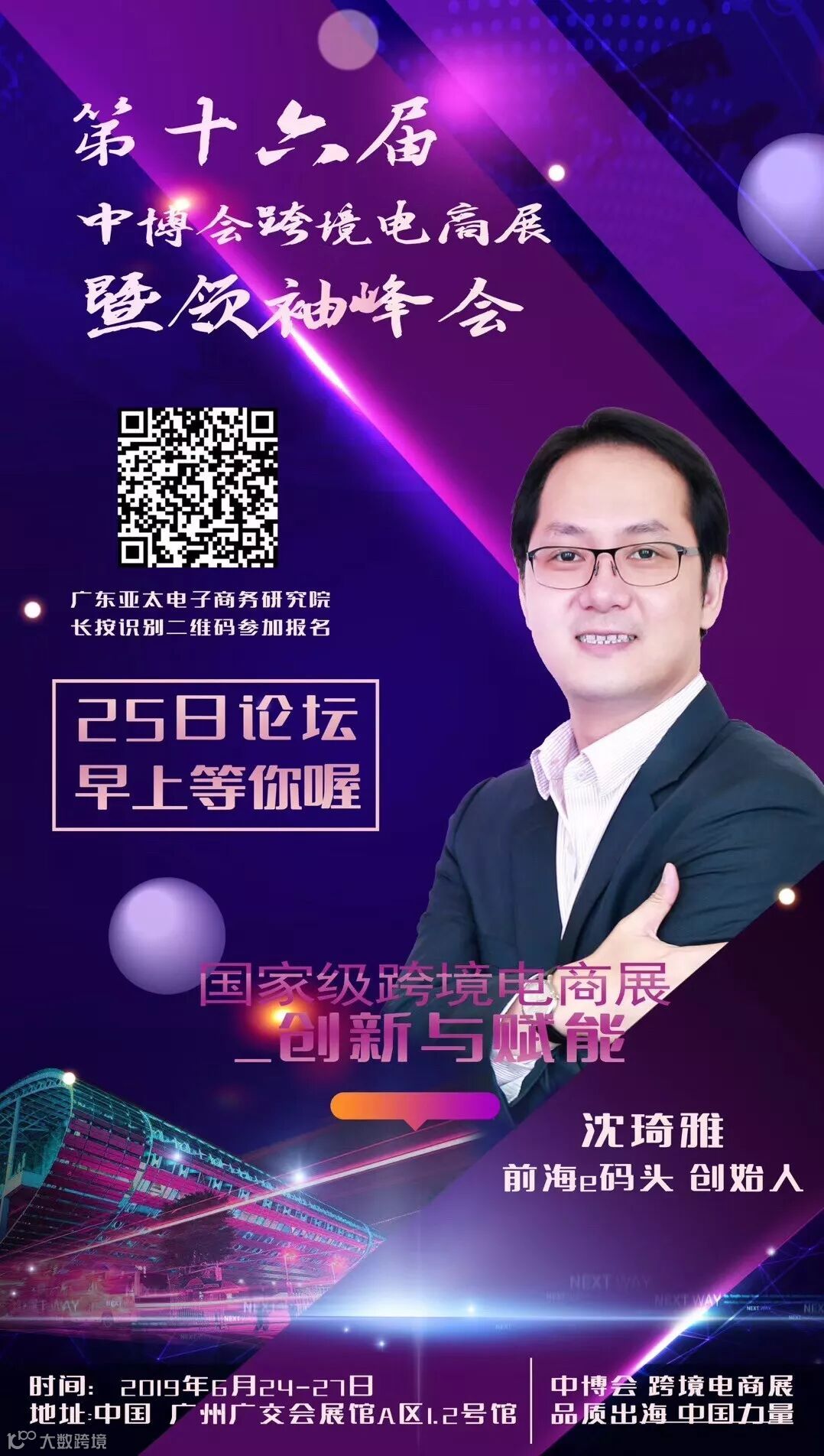 而“第十六届中博会跨境电商展暨领袖峰会二:创新与赋能——拥抱全球贸易新趋势”主旨演讲将于2019年06月25日(上午10:00)开幕。e码头创始人沈琦雅董事长受邀作【保税新零售:助力粤港澳大湾区贸易便利化发展】的主题演讲,期待您的参与!