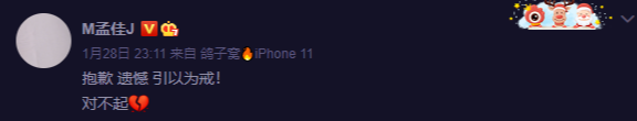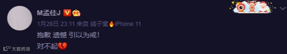 40分钟后孟佳才亲自发微博道歉,短短11个字,既不知道她对谁道歉,也不知道她在“遗憾”什么?