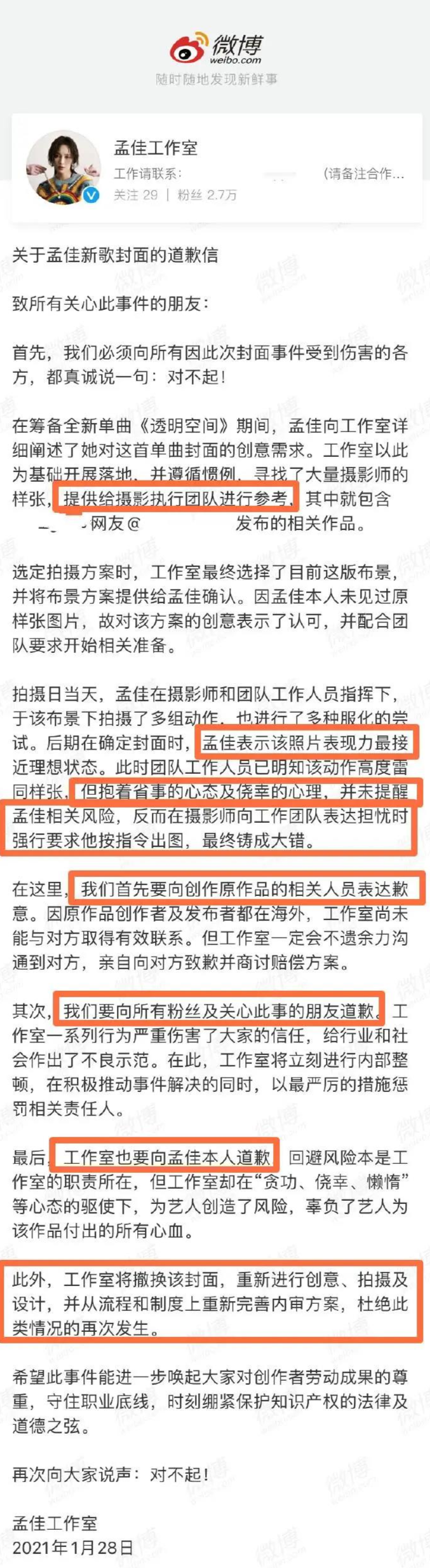 1月28日,针对孟佳新歌封面抄袭一事,孟佳工作室发文道歉。