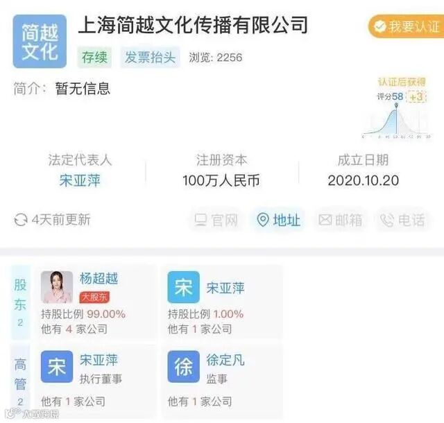 天眼查现实,杨超越落户的申报公司上海简越文化传播有限公司,杨超越持股比例99%为最大股东。