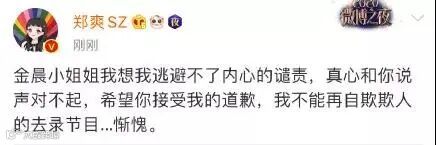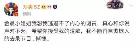 既然回归了,那就好好做节目吧,郑爽还没消停,又发了一条微博向金晨道歉。
