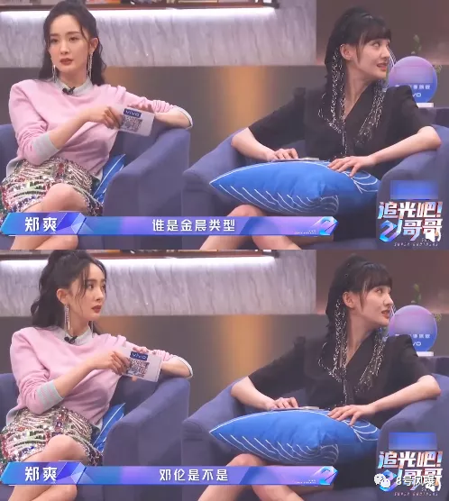 郑爽跟选手聊天时,因为对方说了一句“谁是金晨的类型”,结果郑爽主动接梗说“邓伦是不是”。