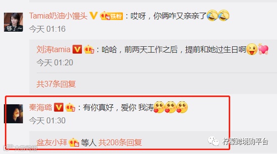 秦海璐随后回复刘涛“有你真好,爱你”,一来一回透露着两人关系亲密。