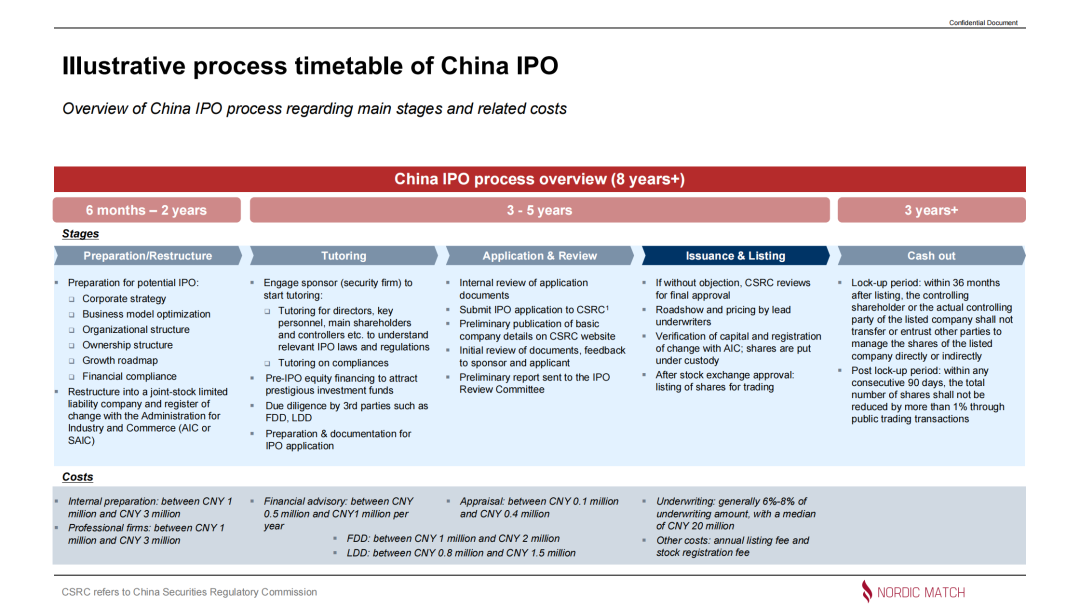 In China, the process starting from preparing for IPO to completely cash out takes more than 8 years. The intermediate process includes Preparation/Restructure, Tutoring, Application & Review, Issuance & listing and Cash out. In Preparation/ Restructure stage, the company needs to prepare and restructure into a joint-stock limited liability company. In Tutoring stage, the company needs to engage a sponsor (security firm) to start tutoring. In Application & Review stage, application documents and a preliminary report are sent to the China Securities Regulatory Commission (CSRC) and IPO review committee. In Issuance & listing stage, when CSRC approves the application, the company will be able to be listed on a stock exchange. There are strict rules for major shareholders to cash out after the company is listed: with a three-year lock-up period and restrictions afterwards.