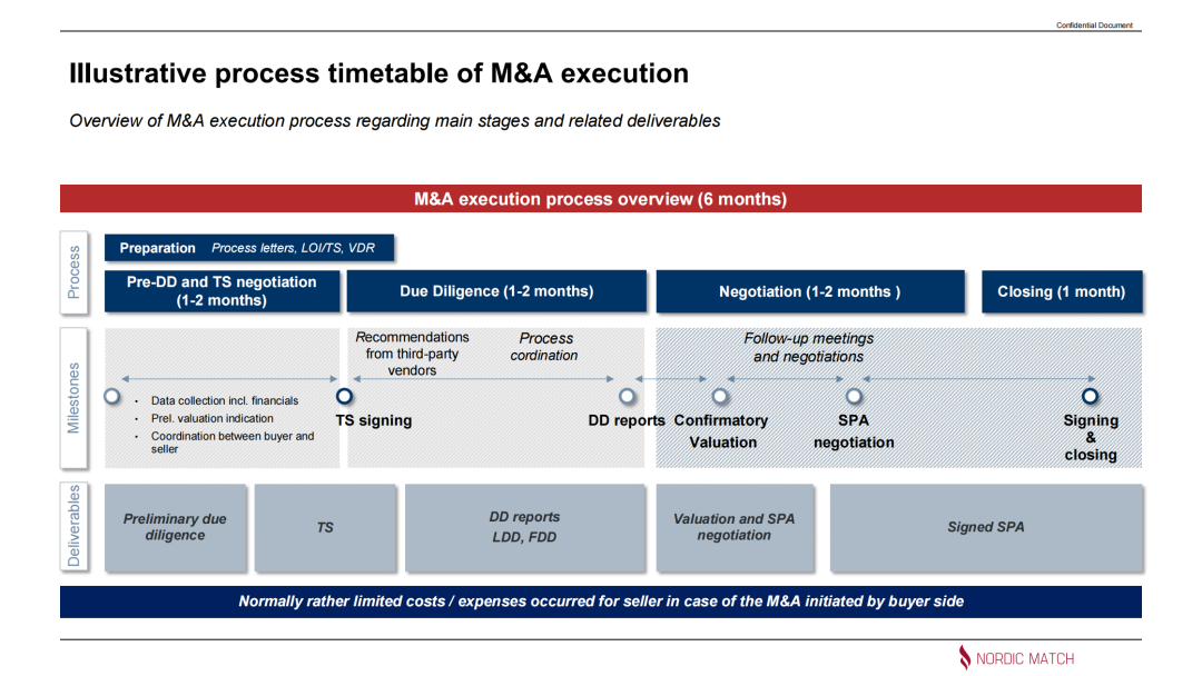 In contrast, below illustrative process timetable shows the general M&A execution overview. The main stages including data collection, TS negotiation, Due Diligence, SPA negotiation and closing, typically takes around 6 months.