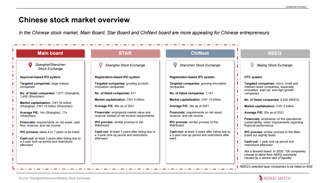 There are four popular boards in the Chinese stock market: The Main Board, STAR, ChiNext and NEEQ. The Main Board, STAR and ChiNext have already established mature IPO systems whereas NEEQ is an OTC system and is relatively immature. The Main Board, STAR and ChiNext are more appealing for Chinese entrepreneurs due to the higher valuation multiples and better liquidity comparing to NEEQ.