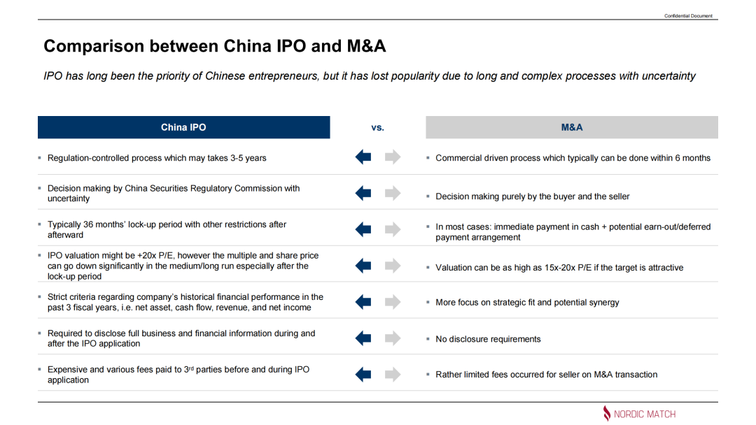 Both IPO and M&A are deals in nature, but there are significant differences between them. To help better understand the differences between IPO and M&A in China, Nordic Match will compare the two tracks in the following paragraphs.