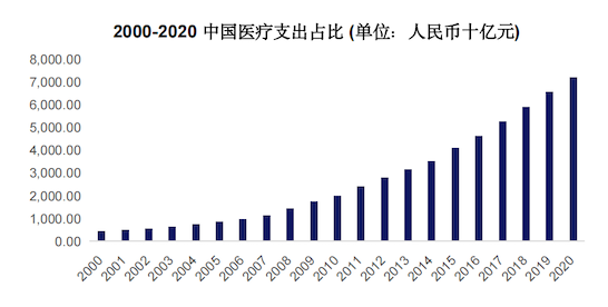 自2009年医疗改革开始以来,中国政府的医疗支出增加了三倍多。2020年,中国医疗支出总额超过7.2万亿元,约占国内生产总值的7%,仍远低于经合组织成员国12.5%和美国16.7%的平均水平。