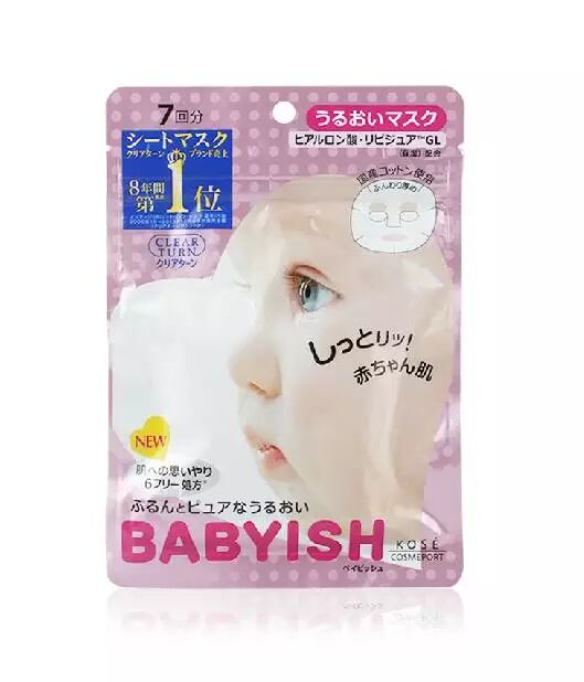 kose 2014年新上市的babyish抗敏面膜,是各位爱新鲜的首选,性价比高。包装抛弃了笨重的盒装改为环保封口袋,更加环保和方便。主打抗敏无添加的这款面膜,不仅秉承了日系一贯的舒适安全,更有效抗敏。更添加了多种有效精华,滋润美白同时轻松拥有宝宝般Q弹柔嫩的肌肤。[柔嫩滋润]透明质酸母菊萃取物氨基酸配合集中滋润改善皮肤富含破尿酸和氨基酸,充分保湿。 新分子量 1/100的纳米玻尿酸美容液角质层滋润浸透至深层的作用发挥。超微小胶原蛋白分子的胶原蛋白成分配合。BABY WATER的保湿独特配方,胎盘油脂构成成分类似的保水功能。