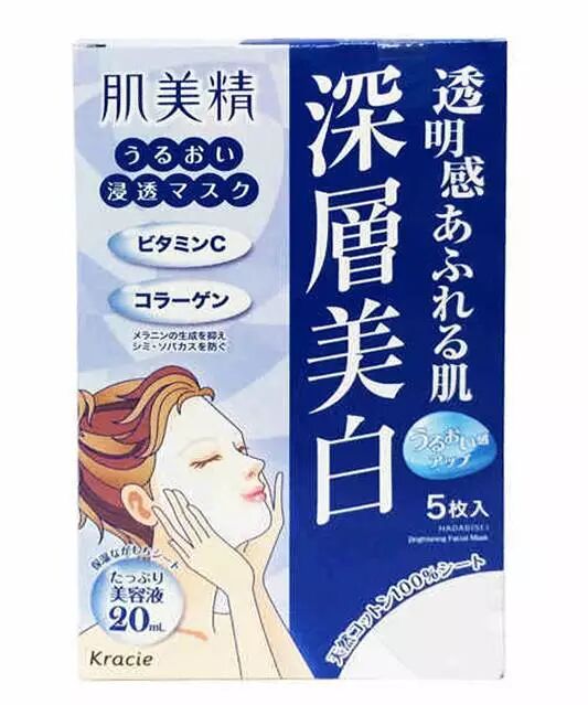 由100%的植物蛋白纤维与天然保湿因子-玻尿酸制成的全新Kanebo水分精华面膜,质地非常细致,保湿性强,无刺激性,一经敷即刻使肌肤呈现无与伦比的完美质感。此次推出的此款面膜每片含有20ml的美白美容液。能渗透至角质层深处,抑制黑色素生成,并能预防由阳光照射而产生的斑点。维生素C与胶原蛋白相配合,同时加入角质柔软成分柠檬精华,在美白的同时彻底滋润肌肤。