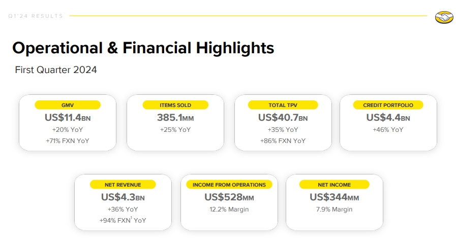 2024年第一季度,美客多创造的商品交易总额(GMV)达到114亿美元,同比增长20%。售出商品为3.85亿件,同比增加25%。