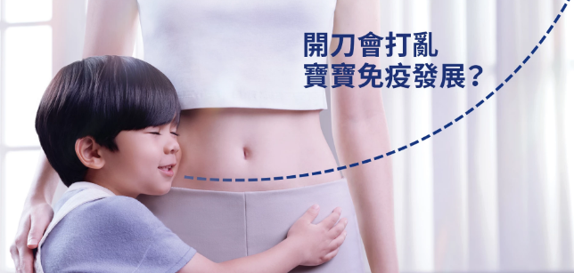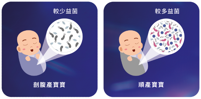 胎儿在妈妈子宫时几乎处于无菌状态,当他们与外界接触一刻起便开始接触细菌,且细菌很快在宝宝的肠道落户。有科学家认为,新生儿最初接触的细菌非常重要,因为这影响到宝宝们免疫系统日后将如何发展及运作。由于生产过程不同,剖腹产宝宝没有经过产道,较少机会得到透过与妈妈皮肤接触而获得的益菌,也可能有延迟上奶等情況。因此和顺产宝宝相比,剖腹产宝宝的肠道「微生物菌从」的害菌比例较多,而益菌则较少,在免疫系统等发展或会有影响,所以建议以母乳喂哺或出生后前100天 (又称黄金免疫期) 尽快促进肠道益菌生长,提升免疫力。