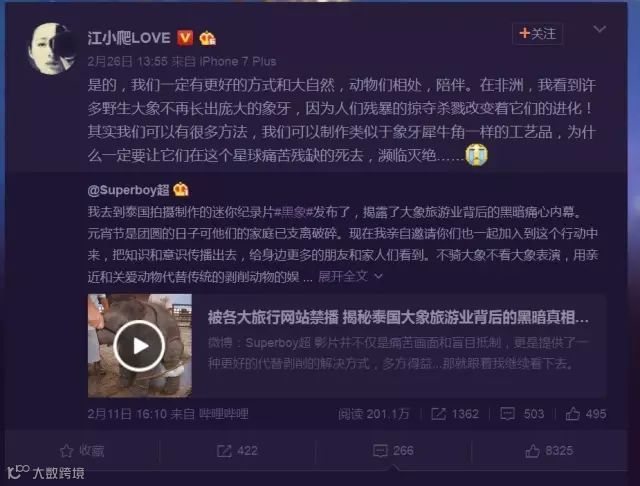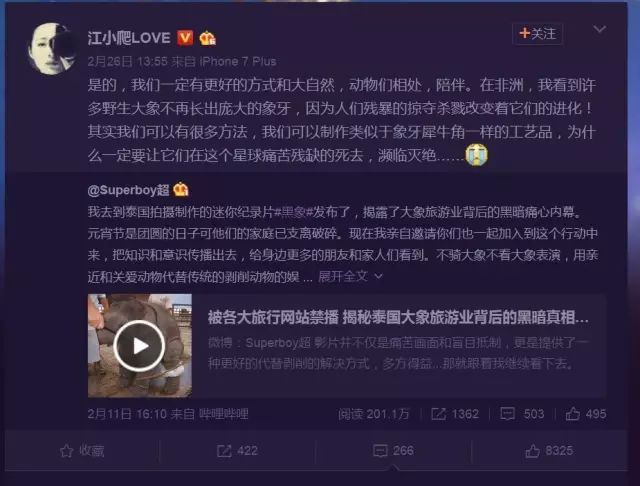 人民日报、央视等媒体纷纷转发,连明星都站出来力挺,印象最深的是江一燕说的 ——“在非洲,我看到许多野生大象不再长出庞大的象牙,因为人们残暴的掠夺杀戮,改变了它们的进化!”