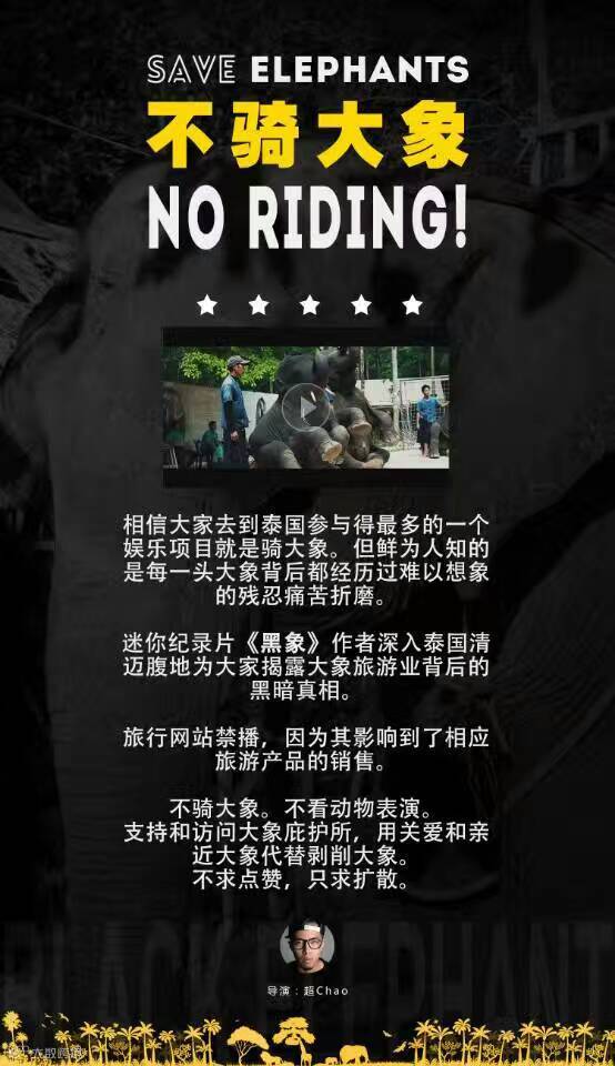或许你不认识他,今年2月,他拍的一部9分钟自制纪录片,揭露了大象旅游背后令人发指的黑幕,被泰国各大旅游网站禁播,却在国内掀起舆论飓风。没有BBC的专业手法,没有明星配音,在没有宣传的情况下,上线10天,点击量破5000万,平均每秒就有58人观看,人民日报、央视新闻纷纷报道,江一燕、杜淳、张馨予等明星主动转发,这就是——《黑象》。