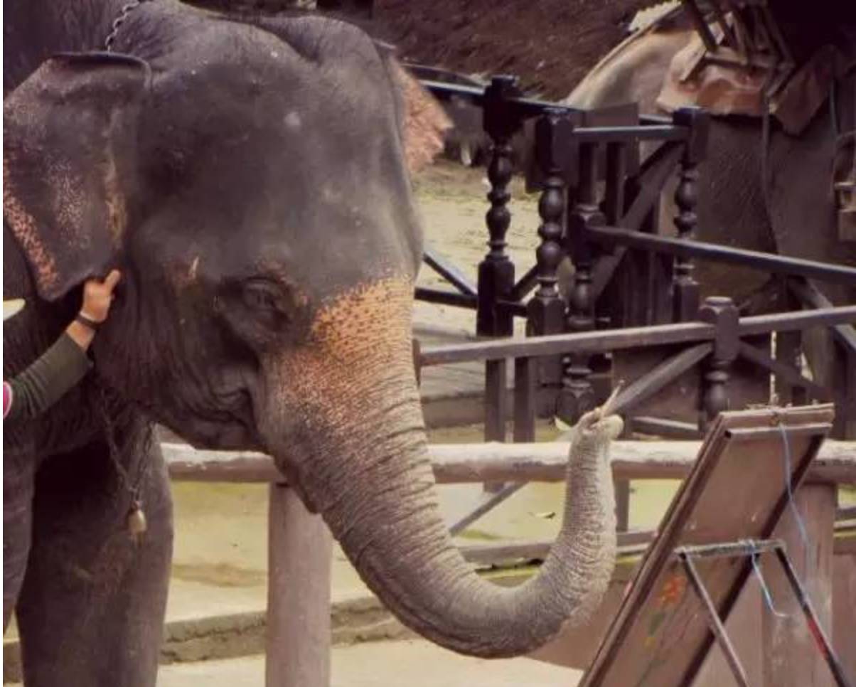 它们一天还要画好多幅,直到最后一位游客离开;撑不住?训象师就在一旁偷偷用指甲掐它们敏感的耳朵。