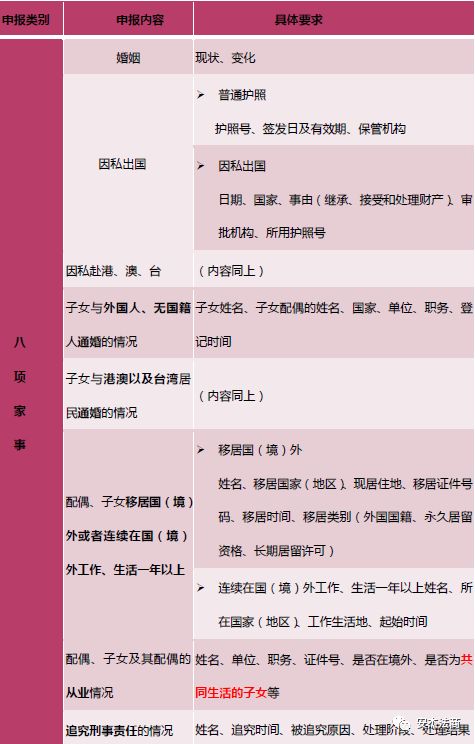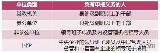 除了党政机关领导干部之外,参照公务员法管理的人民团体和事业单位的人员(以下简称为“参公单位的人员”);未列入参照公务员法管理的人民团体和事业单位的人员(以下简称为“非参公单位的人员”)中的领导班子成员及内设管理机构领导人员;中央企业的领导班子成员及中层管理人员、省管和市管国有企业的领导班子成员均需要进行有关家事、家产的个人事项报告,需要特别注意的是,虽然对于科级人员没有规定申报义务,但是当科级人员提拔至副处级时也需要进行财产申报,经申报审查后才可以提拔。详见下表: