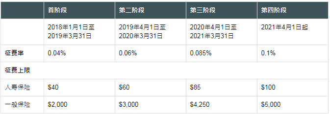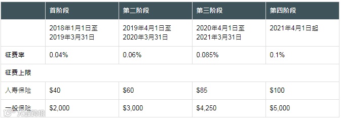 据上表,在首阶段征费期内(2018年1月1日至2019年3月31日),整付保费或年度化保费为港币10万及以上的人寿保险保单,征费上限为每保单年度港币40;整付保费或年度化保费为港币500万及以上的一般保险保单,征费上限为每保单年度港币2,000。