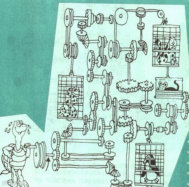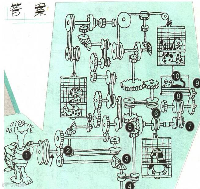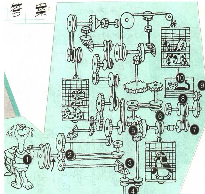 1处乌龟摇转齿轮使2处的齿轮转动,带动3、4、5处齿轮转动。因6处的门被关紧,带动7处的齿轮转动,并带动8处的齿轮转动,9处的门被打开,10处的小老鼠被放了出来。