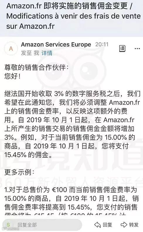 从卖家收到的邮件我们可以看到,此次法国站销售佣金费率的调整是受法国向亚马逊征收3%的数字服务税的影响,亚马逊将需要上缴的税费直接转嫁到了法国站卖家的身上。
