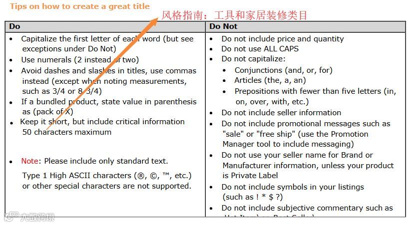 2、按照分类去下载风格指南PDF,查看Title Style。例如:工具和家居装修类目,找到Title Style板块,发现字符上限50(注意:以文字内容为准,不参考示例标题的字符数量)