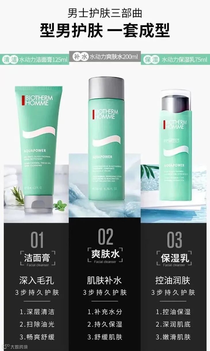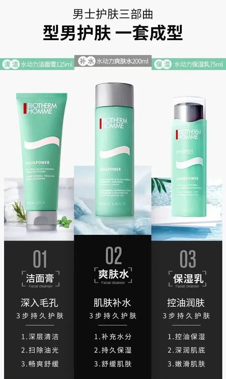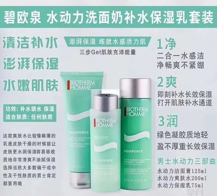这款水动力是专门为男士肌肤设计,包含洁面膏、爽肤水和保湿乳 从洁面到护肤一气呵成便捷高效。